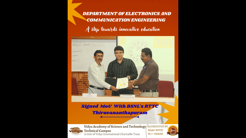 The Department of Electronics and Communication Engineering, Vidya Academy of Science and Technology Technical Campus, Killimanoor,TVM, has signed an MoU with BSNL's RTTC Thiruvananthapuram! Represented by Dr. Pravin Rose T, Placement Manager and Mr...