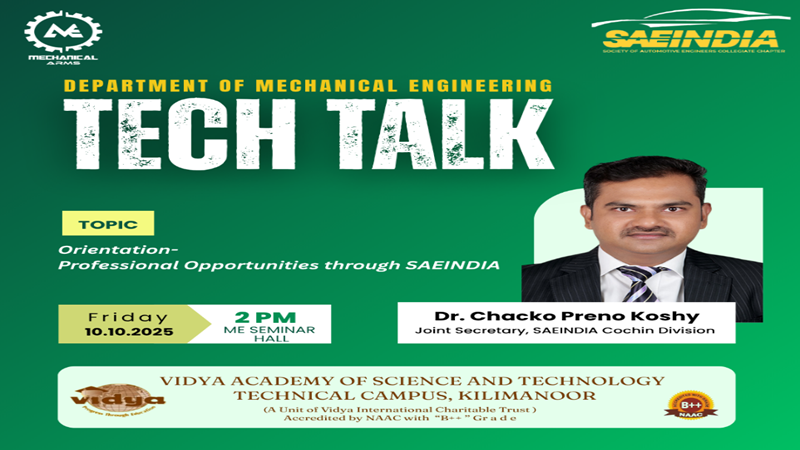 The Department of Mechanical Engineering, Vidya Academy of Science and Technology Technical Campus, Kilimanoor, organized an enlightening Tech Talk on the topic “Orientation – Professional Opportunities through SAEINDIA” on 10th October 2025 at 2:00 PM in the Mechanical Engineering Seminar Hall.