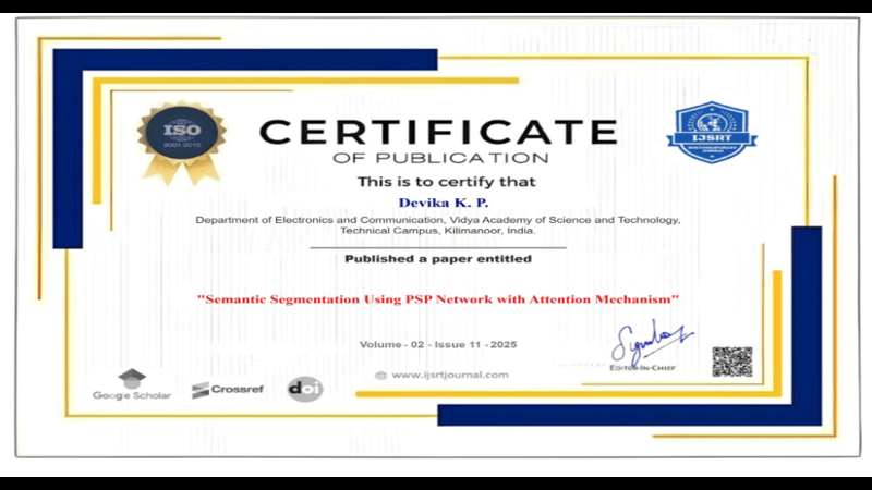 The published paper, titled “Semantic Segmentation Using PSP Network with Attention Mechanism,” explores advancements in image segmentation techniques and this publication appears in Volume 2, Issue 11 (November 2025) of the journal and highlights ongoing innovation in the field of computer vision and machine learning.This achievement reflects not only technical expertise but also the researcher’s commitment to innovation and academic excellence.