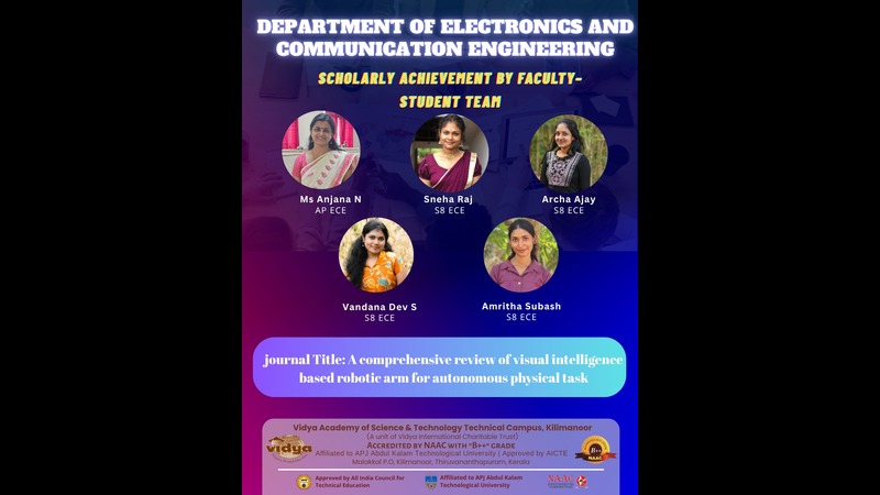 Project Batch consisting of Amritha Subhash, Archa Ajay, Sneha Raj M and Vandana Dev S a group of final-year students (2022-26 Batch S8 ECE) successfully published a research paper in the International Journal of Research and Analytical Reviews (IJRAR), on 16th March 2026 under the guidance of Ms. Anjana N Assistant Professor ECE.
