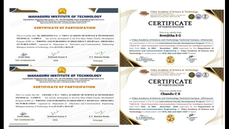 Ms. Sreejitha S G (AP, ECE) and Mr. Chandu C B (AP, ECE), successfully participated in a Five-Day Online Faculty Development Program titled “Writing and Publishing in High Impact Journals: From Idea to Publication”. The FDP was organized by the Department of Electronics and Communication Engineering, Mahaguru Institute of Technology, Kerala, and was held from November 21–26, 2025. They also participated in a six-day International Faculty Development Program on "NGCF-IS' - Next-Generation Communication Framework for Intelligent Systems" conducted at Vidya Academy of Science and Technology, Thrissur. The event took place from November 24th to 29th, 2025, in collaboration with ISTE, IE(I), and IQAC VAST Chapter.