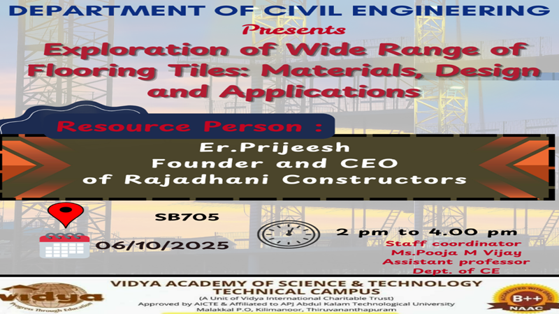 A total of 67 students actively participated in the session. The resource person for the seminar was Er. Prijeesh, CEO and Founder of Rajadhani Constructors, Trivandrum, delivered an insightful and engaging presentation on the various flooring tiles, their material composition, design aspects, and practical applications.