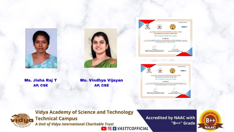 We are delighted to share that Ms. Jisha Raj T and Ms. Vindhya Vijayan, Assistant Professors at Vidya Academy of Science and Technology, Technical Campus (VAST TC), have successfully completed the AICTE Training and Learning (ATAL) Academy Faculty Development Program (FDP) on “AI in Education”, organized by Abdul Razzak Kalsekar Polytechnic from 13th to 18th October 2025.