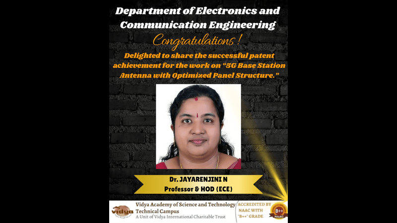 Dr. Jayarenjini N, Professor and Head of the Department of Electronics and Communication Engineering at Vidya Academy of Science and Technology, has secured a UK Design Patent from the United Kingdom Intellectual Property Office, marking a significant research achievement.