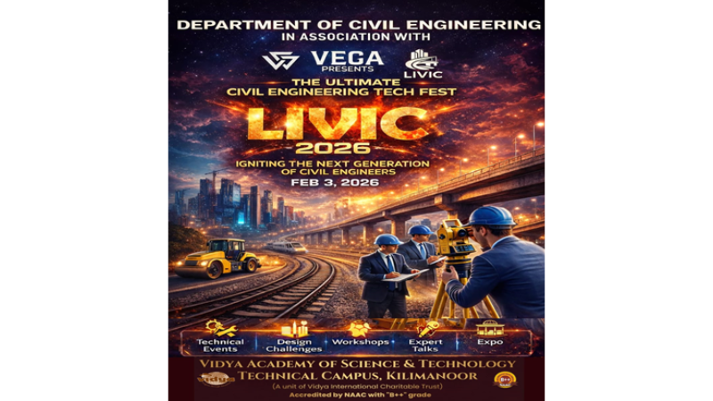The Department of Civil Engineering successfully conducted its Department Techfest “LIVIC 2K26” in association with VEGA 2K26 on 3rd February 2026. The programme was coordinated by Ms. Nayana Gopan (Assistant Professor – Civil Engineering) and witnessed enthusiastic participation from students and visitors. The Techfest served as a vibrant platform for students to showcase technical skills, creativity, and innovative engineering concepts beyond regular academics.