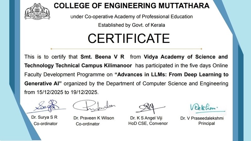 Ms. Beena V. R., Assistant Professor in the Department of Computer Science and Engineering, Vidya Academy of Science and Technology Technical Campus, Kilimanoor, participated in a Five-Day Online Faculty Development Programme (FDP) titled “Advances in LLMs: From Deep Learning to Generative AI.”