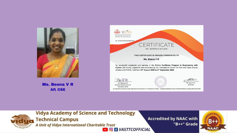 Held from 13th August to 2nd September 2025, the program aimed to enhance participant’s technical expertise in Python and its applications in engineering. The final project presentation was held on 18th October 2025. This achievement stands as a testament to Ms. Beena V. R.’s dedication to continuous learning and her commitment to promoting Open-Source technologies in the academic and professional domains.
