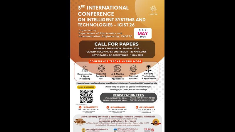 The Department of Electronics and Communication Engineering is proud to announce the 3rd International Conference on Intelligent Systems and Technologies (ICIST 2026). The conference will be held on May 5 & 6, 2026, at Vidya Academy of Science and Technology Technical Campus, Kilimanoor. From revolutionizing healthcare to optimizing transportation, intelligent systems continue to reshape a wide range of sectors. ICIST 2026 aims to provide a vibrant platform for meaningful interaction and the exchange of research ideas among scholars, professionals, and students, highlighting the transformative impact of these technologies across industries.