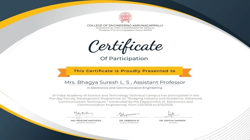Mrs. Bhagya Suresh L. S, Assistant Professor, Department of Electronics and Communication Engineering, successfully participated on a five-day Faculty Development Programme (FDP) titled “Bridging Industry and Academia: Advanced Communication Techniques”, held from 01 December 2025 to 05 December 2025.The certificate of participation was received on 08 December 2025. The programme was organized by the College of Engineering, Karunagapally and provided valuable insights into contemporary communication technologies, fostering stronger academia–industry connections.
